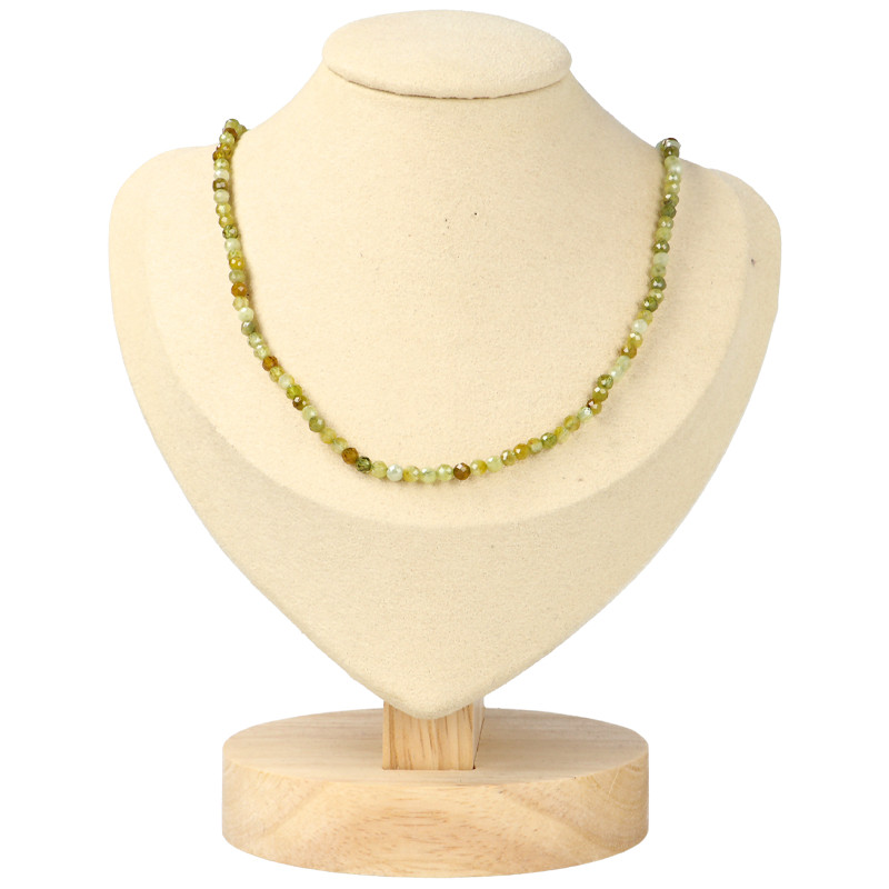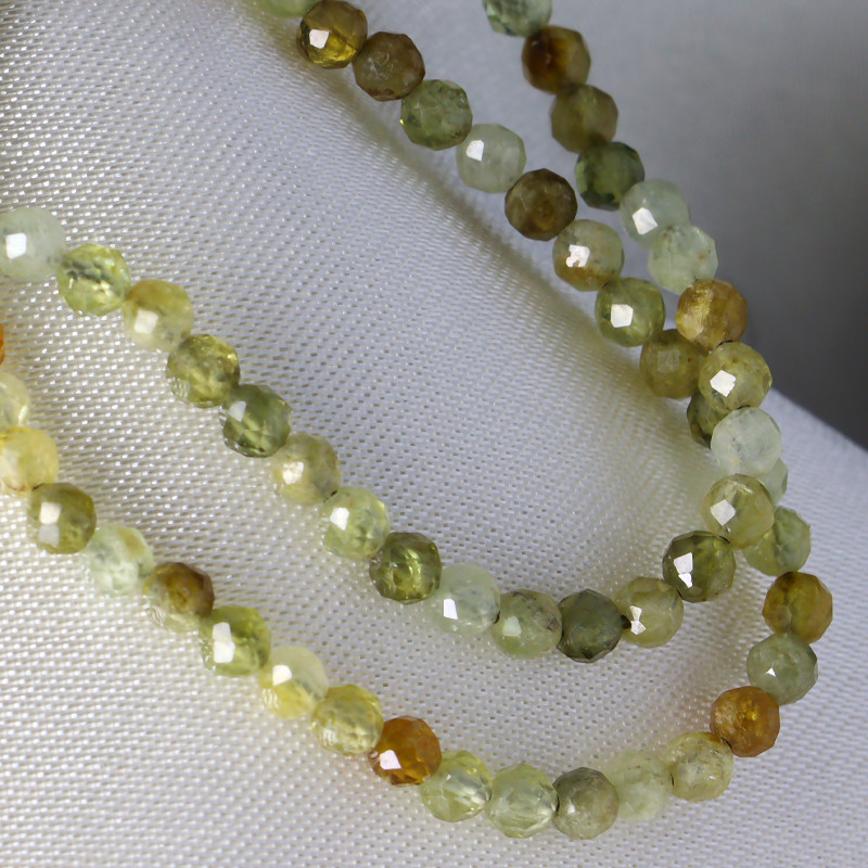 3 mm-es fazettált zöld gránátból fűzött 38 cm-es nyaklánc, kb. 2 cm-nyi csavaros valódi 925 ezüst ékszeralkatrésszel.